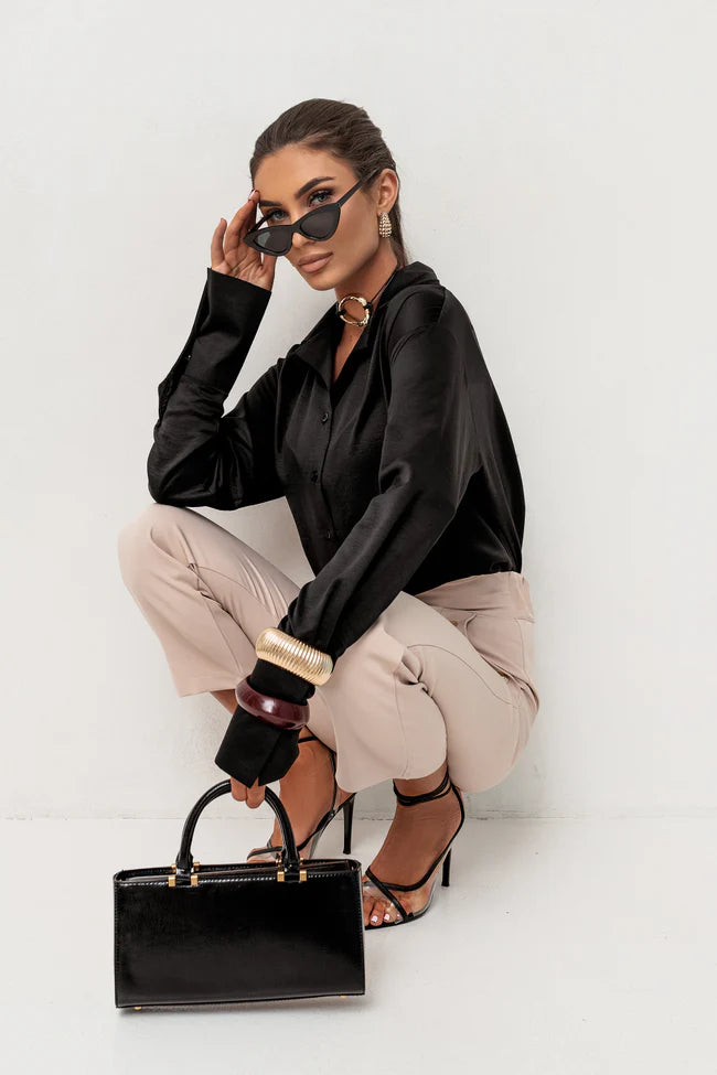 Koszula Satynowa MADDIE w kolorze czarnym to kwintesencja eleganckji i komfortu. Wykonana z miękkiej wiskozy z dodatkiem elastanu, zapewnia wyjątkowy komfort noszenia. Satynowy połysk nadaje jej luksusowego charakteru, a luźny krój oversize gwarantuje swobodę ruchów. Idealna zarówno do stylizacji biznesowych, jak i casualowych - wystarczy zmienić dodatki. Długi rękaw i uniwersalny fason sprawiają, że koszula MADDIE to must-have w garderobie każdej kobiety ceniącej ponadczasowy styl. Cechy produktu: